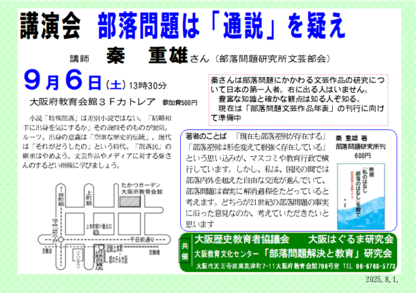 教育講座 部落問題入門=10月14日で決定